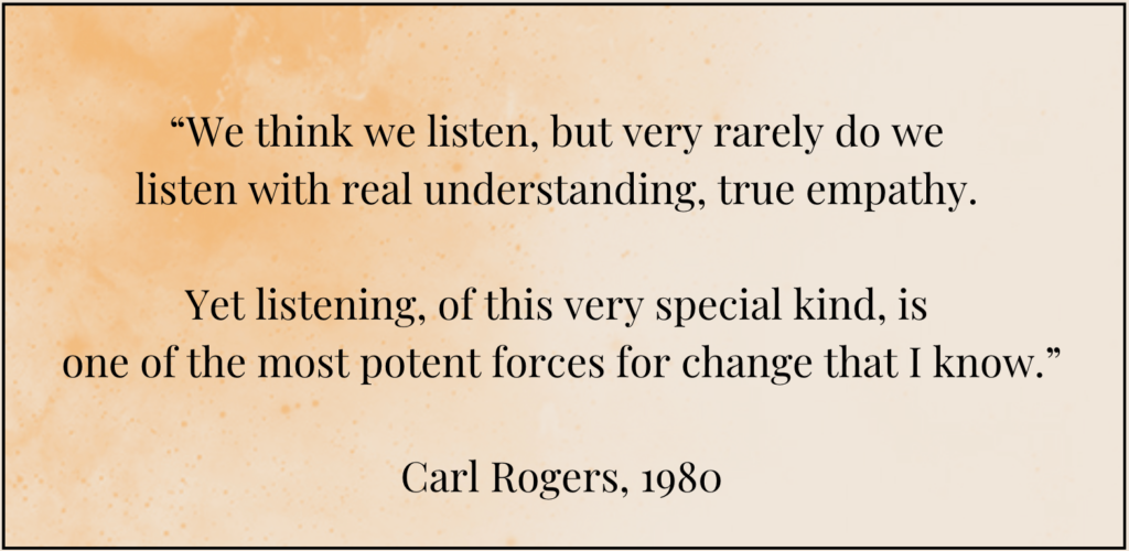 Rogers, C., & Farson, R. (1957). Active listening. In C. Rogers & R. Farson (Eds.), The Carl Rogers Reader (pp. 239–245). Houghton Mifflin.